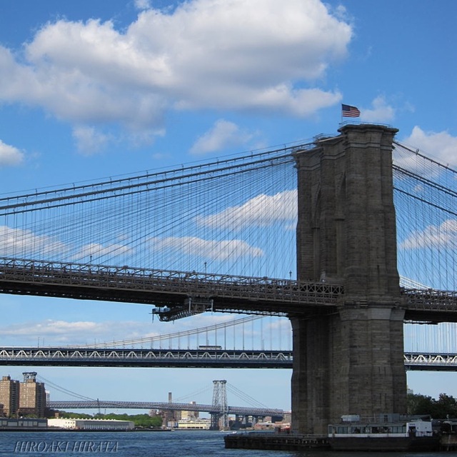 水上タクシーから橋を望みます。 やっぱり綺麗ですよね、この橋♪ 後ろに見えるのがマンハッタンブリッジ。 この辺りの地理、だいぶ詳しくなりました。 ん? 奥に見えるもう一つの橋は何だ? レインボーブリッジか???